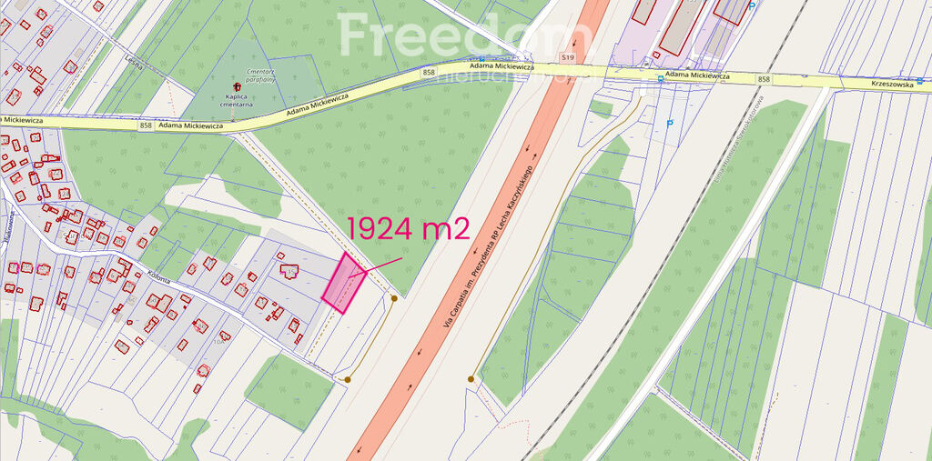 Działka o powierzchni około 1924 m2 składa się z dwóch